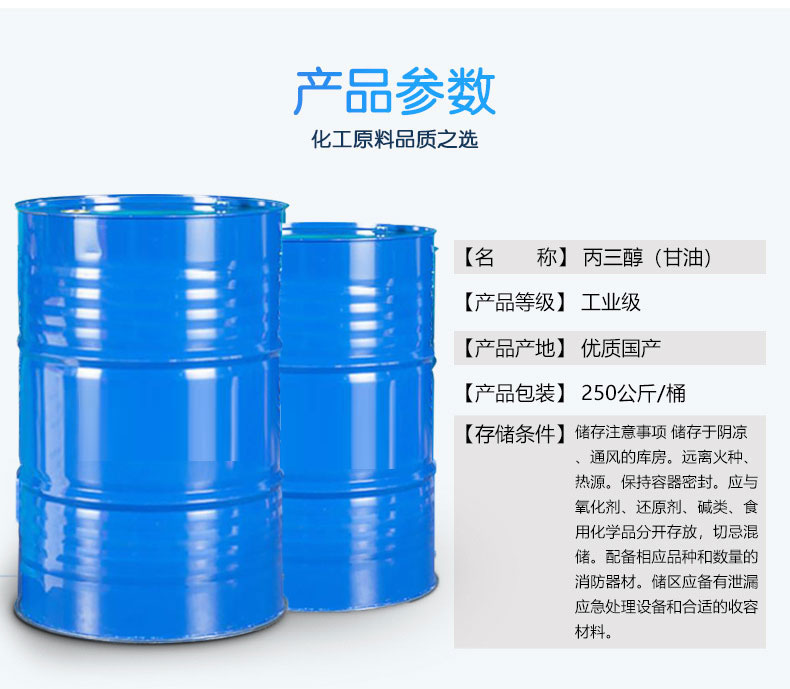 2. 采用鋁桶或鍍鋅鐵桶包裝或用酚醛樹脂襯里的貯槽貯存。貯運中要防潮、防熱、防水。禁止將甘油與強氧化劑(如硝酸、高錳酸鉀等)放在一起。按一般易燃化學品規定貯運。