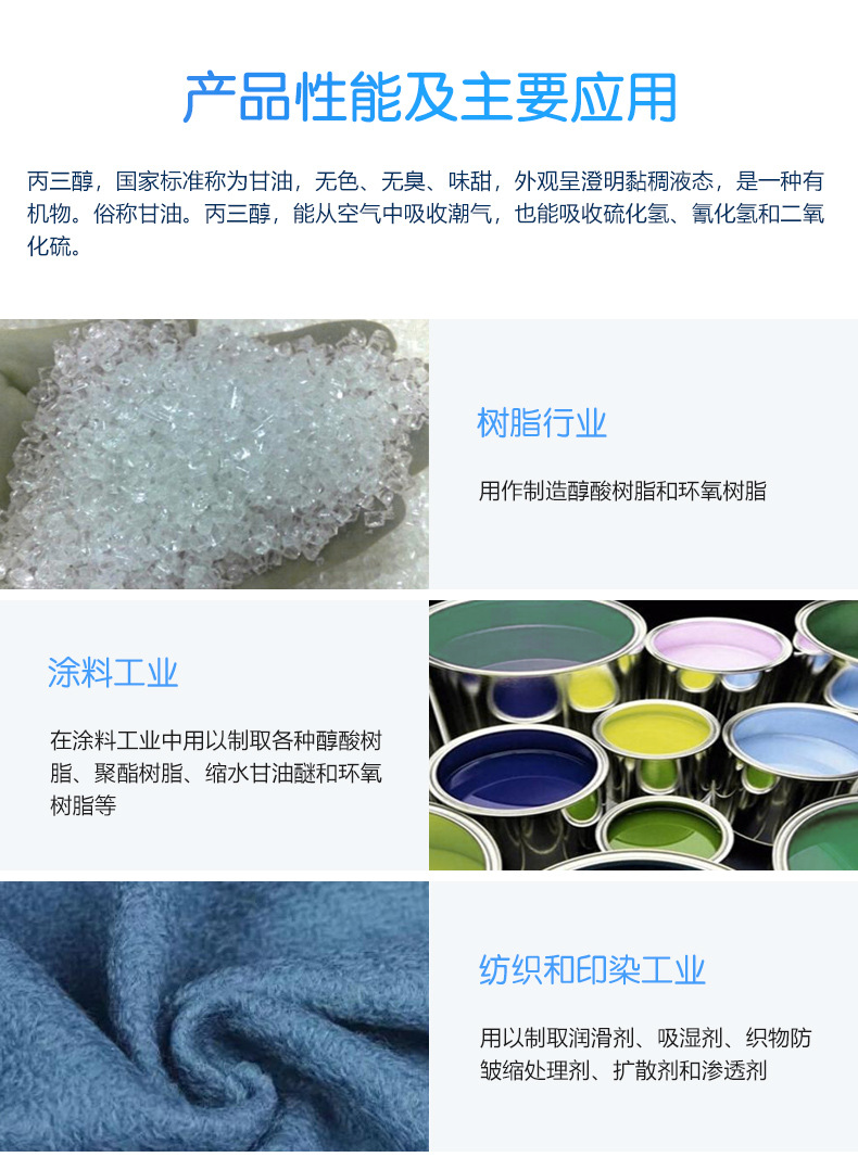 丙三醇 三羥基丙烷 毛甘油 吸濕劑、抗凍劑、潤滑劑、溶劑及助溶劑 |